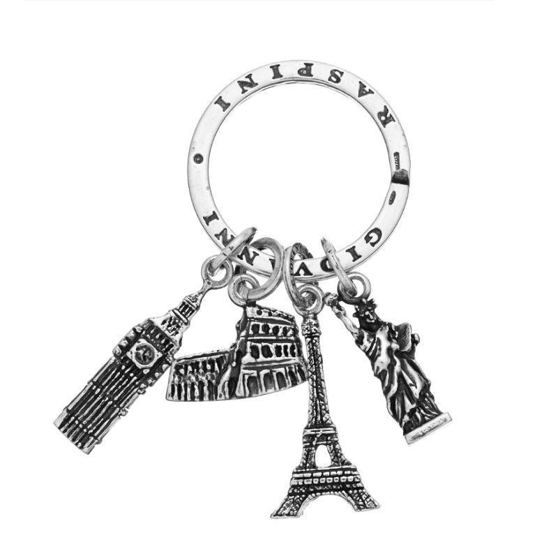 Portachiavi Charms Viaggiformato da 4 charms di Colosseo, Statua della Libertà, Big Bang e Tour Eiffel.