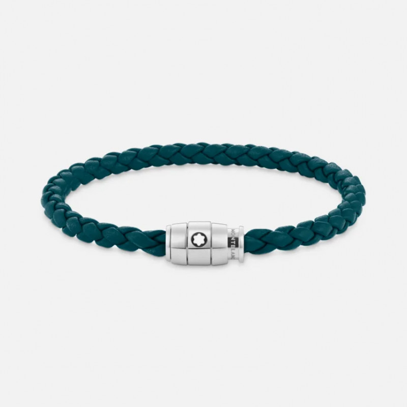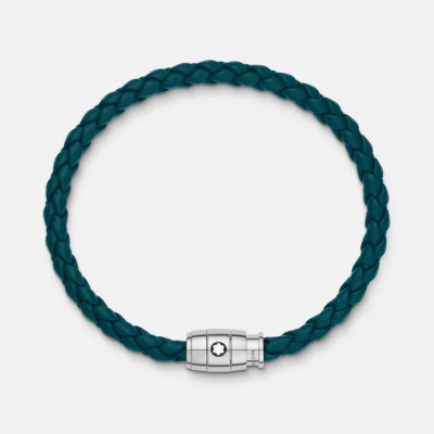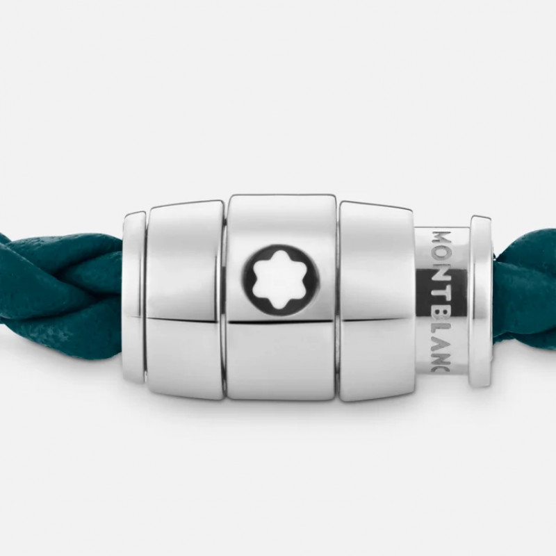 Bracciale Montblanc in pelle color Blu Cipro e 3 anelli in acciaio pregiato finitura lucida.