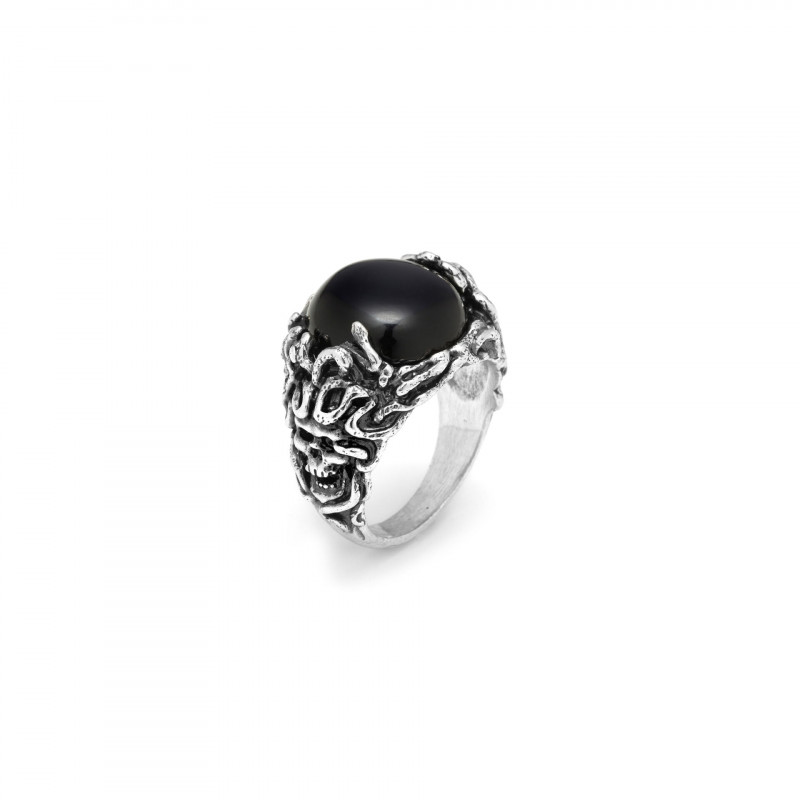 Un luminoso gioiello in argento per le tante anime di un uomo. Chiaroscuri e texture contemporanee per un anello realizzato completamente a mano attraverso l'antica tecnica della fusione a cera persa, ed abbinato alla morbida luminosità di un cabochon centrale in onice nera.