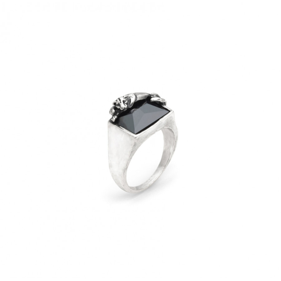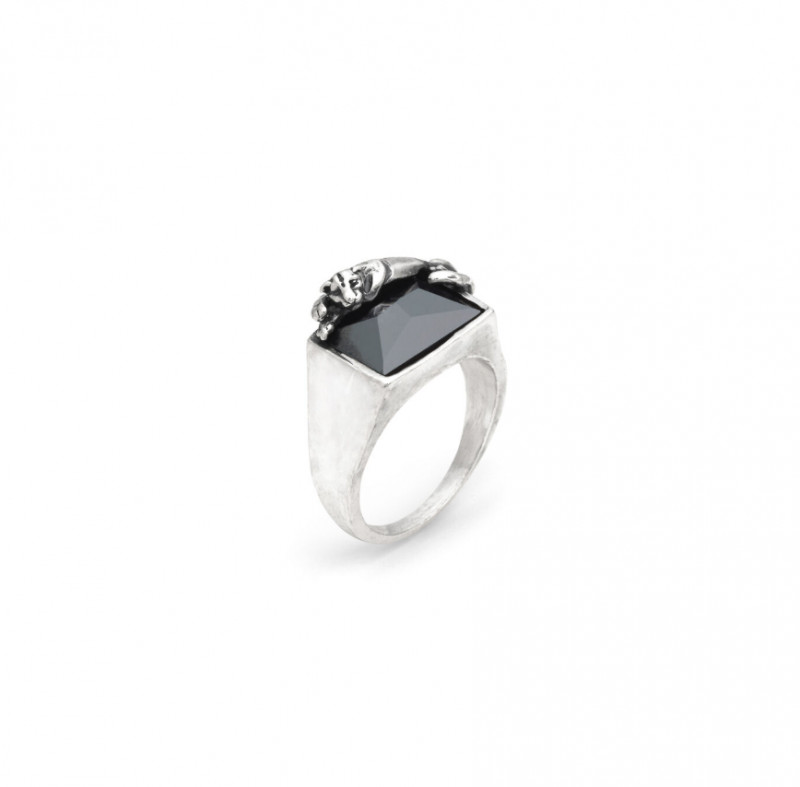 Design maschile ed eleganza scultorea animalier per un anello da uomo in argento che nasce dal dialogo fra l'ematite scura in taglio sfaccettato e la forma luminosa della pantera in argento, fusa a cera persa e brunita, che si adagia sulla pietra. Fatto a mano in azienda.