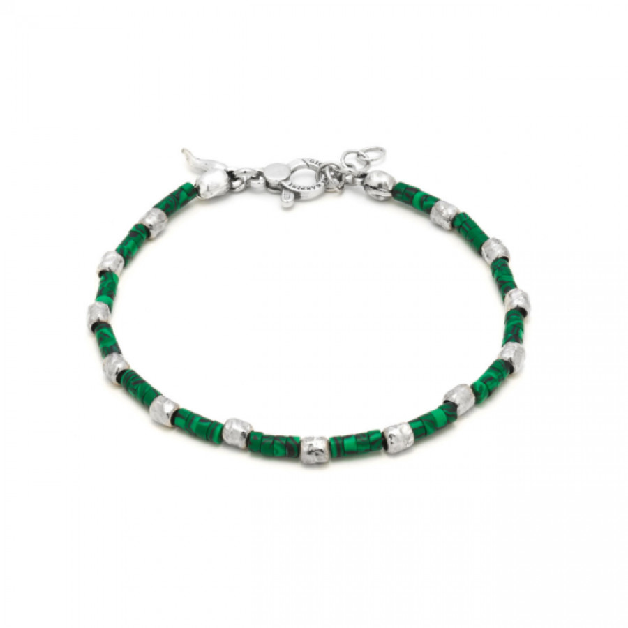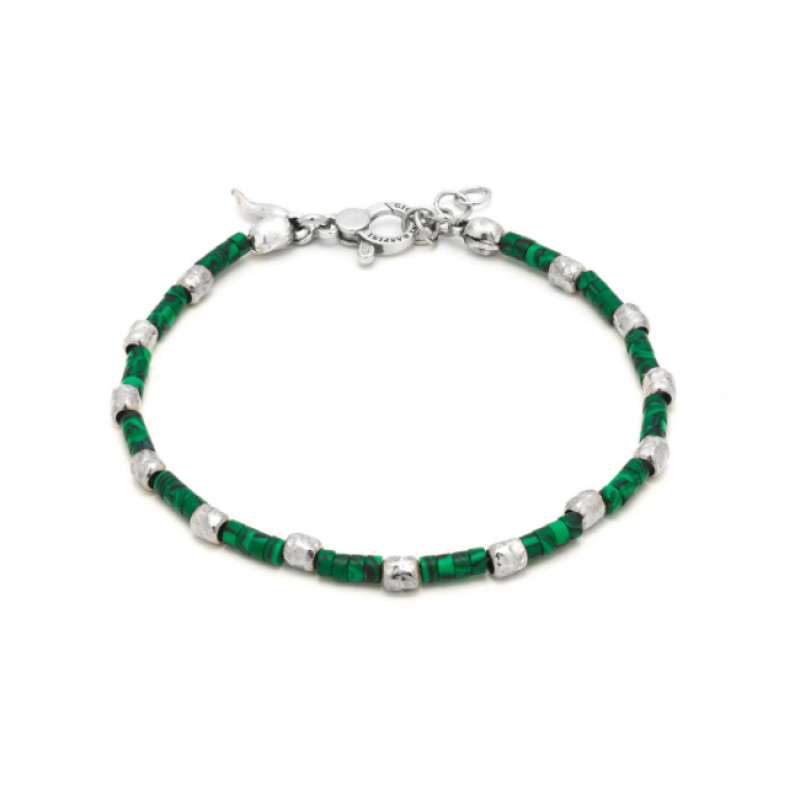 Indossa i colori della natura. Questo bracciale alterna piccoli e stilosi elementi in argento ad altri in malachite, la pietra naturale dalle mille sfumature di verde brillante. Un gioiello delicato, dall'eleganza minimalista, perfetto per l'indosso multiplo.