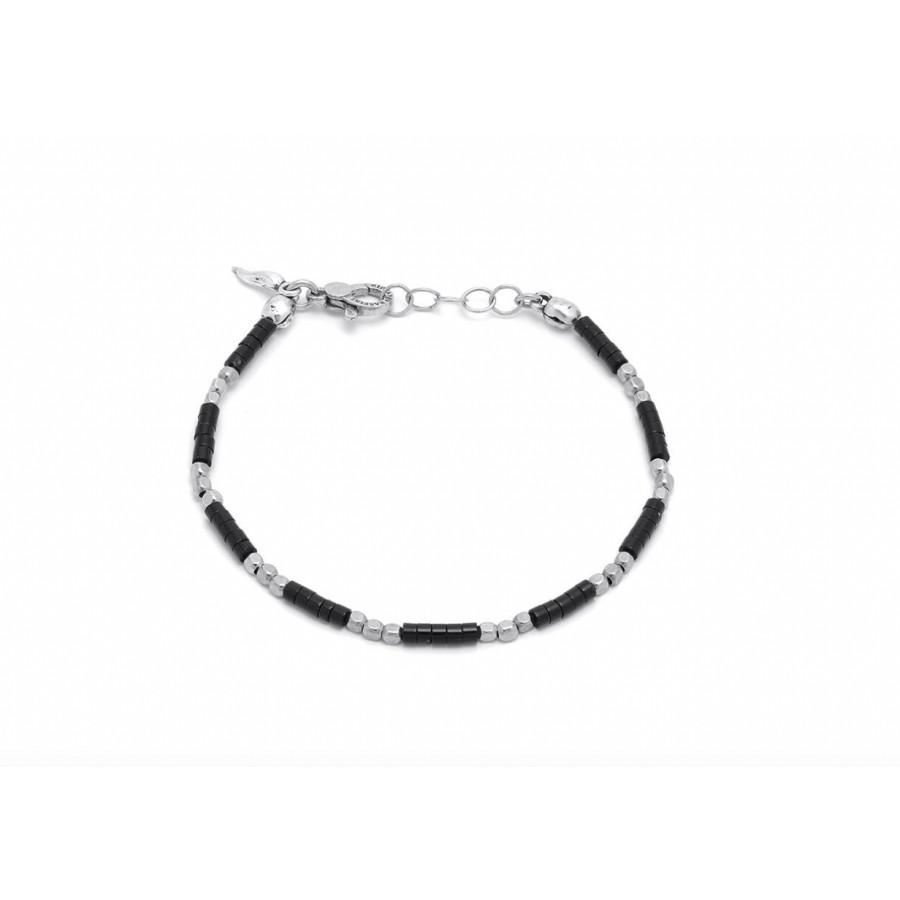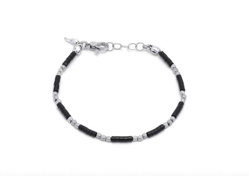 Onice nera ed elementi in argento fuso e brunito che duettano al polso di un uomo, con prevalenza ritmica del decoro in onice nel Bracciale Onice e Dadini. Tutta la semplice leggerezza di un bracciale contemporaneo, realizzato a mano in Italia.