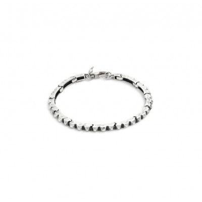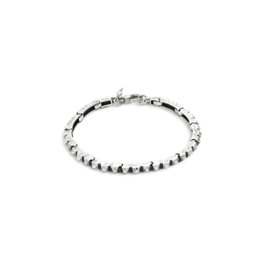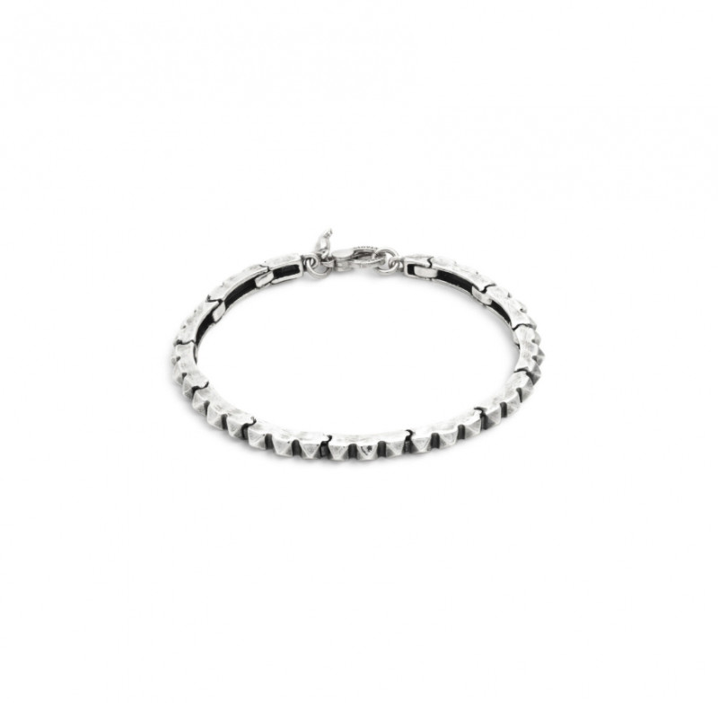 Un bracciale forte e luminoso, in argento brunito, realizzato da una sequenza di segmenti sormontati da piccole borchie. Un gioiello contemporaneo all'insegna della continuità visiva, fatto completamente in azienda con maestria artigianale.