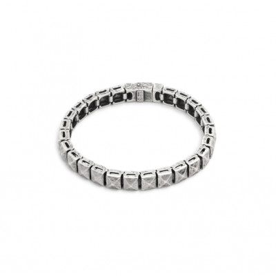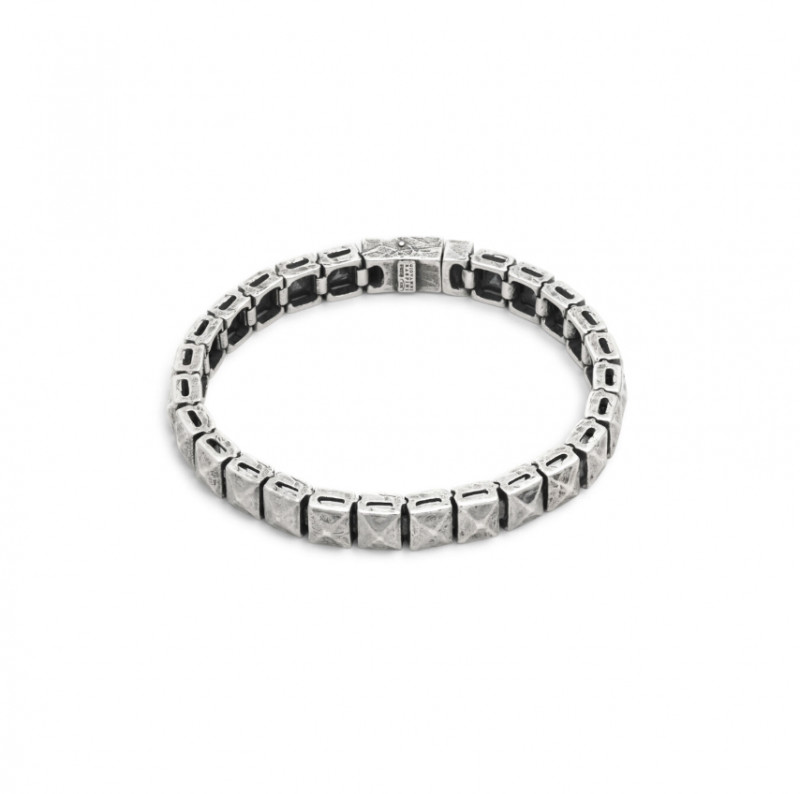 Per chi ama un look deciso e di forte carattere. Questo bracciale in argento brunito è costituito da tanti segmenti quadrati, ognuno dei quali presenta il decoro di una singola borchia piramidale. Realizzato a mano in azienda, con la tecnica tradizionale della fusione a cera persa.