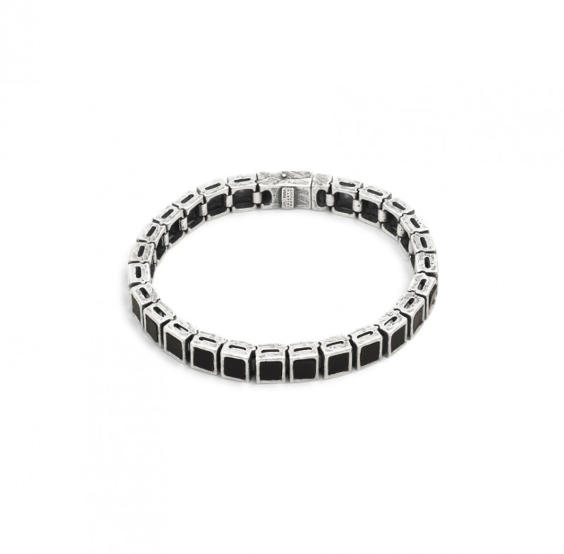Argento brunito e resina nera per un iconico bracciale Tennis Box. Realizzato con una sequenza di castoni quadrati in argento, ognuno dei quali ospita una resina nera leggermente opaca. Un dettaglio che aggiunge modernità e contrasto materico al gioiello. Fatto a mano in azienda.