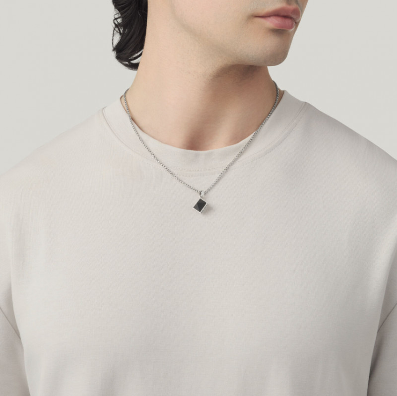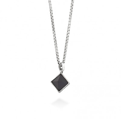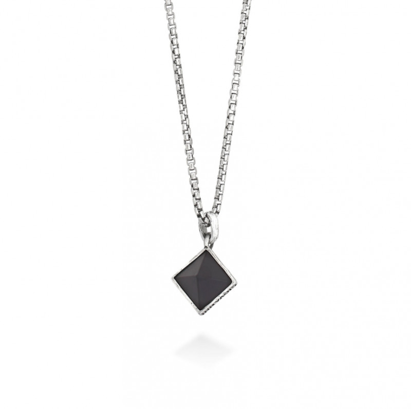 Il pendente di questa collana è una grande borchia in resina nera, inserita in un castone in argento brunito che riproduce la stessa forma anche sul retro. Un'eleganza fatta di contrasti, fra il nero della pietra e la luminosità dell'argento. Completa il gioiello una catena di 50 cm.
