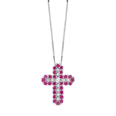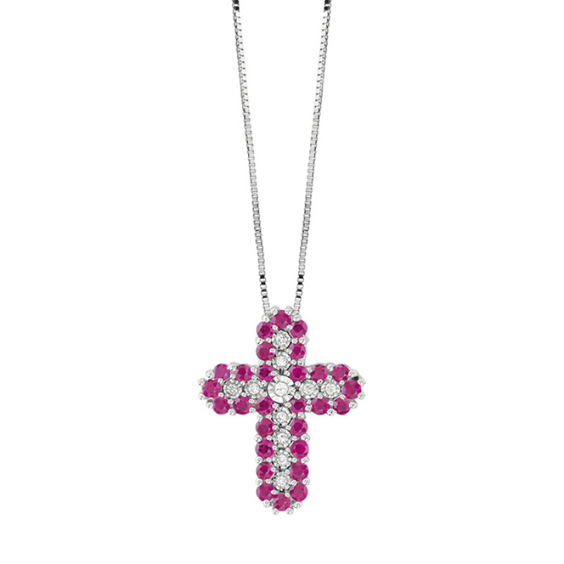 Collierino Bliss Rugiada Colors con croce in oro bianco 18 kt e diamanti con rubini e taglio rotondo