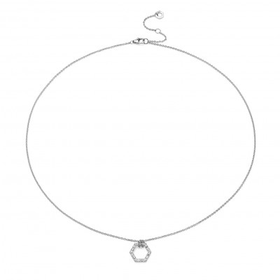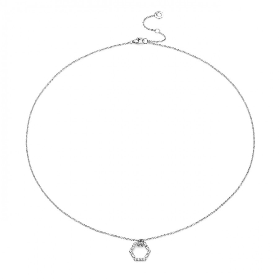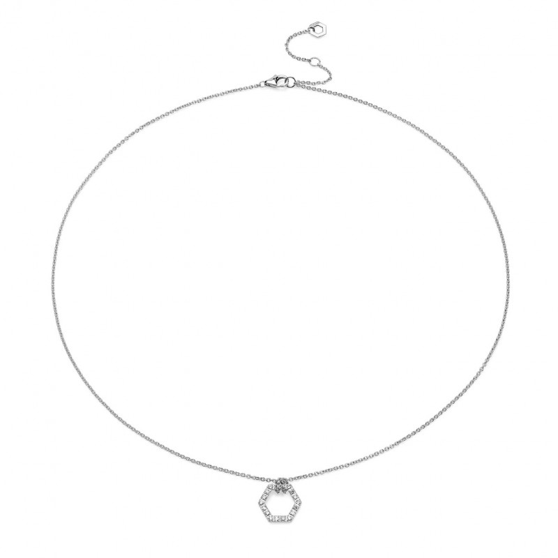 I gioielli Amuleto nascono dalla forma di un esagono, che rappresenta la vita nella Natura, e diventa simbolo di fortuna. La collana Amuleto oro bianco e full pavè di diamanti S, con diamanti privi di conflitti, è il gioiello artigianale ideale per ogni occasione.