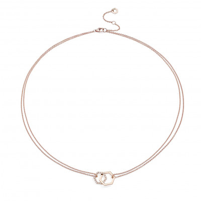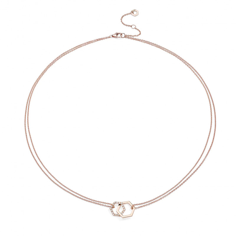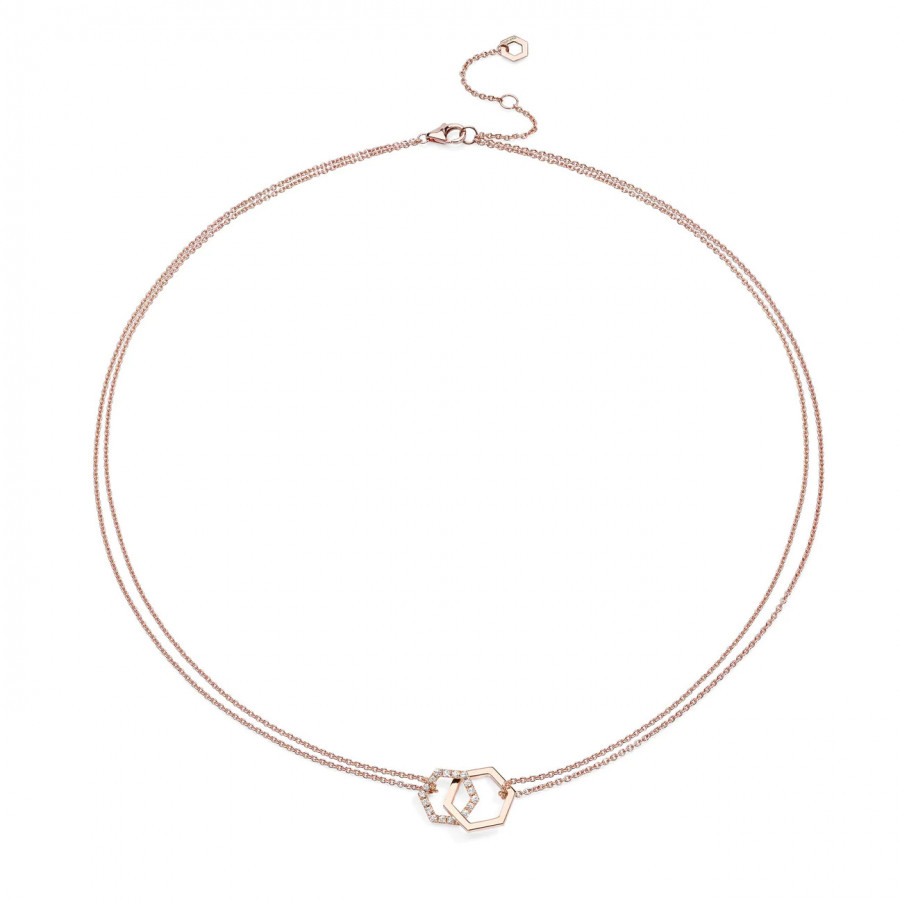 Un'elegante catena in oro rosa 18 kt e diamanti ct. 0,18 F VVS con due esagoni intrecciati come anime gemelle per sempre legate in un prezioso abbraccio. Celebra la vita e l'amore con la collana Amuleto Double oro rosa.
