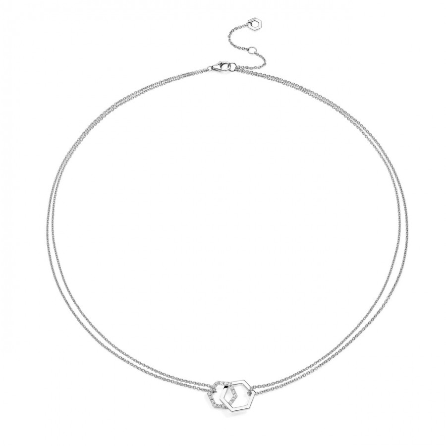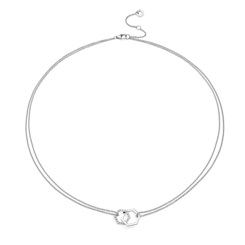 Un'elegante catena in oro bianco 18 kt e diamanti ct. 0,18 F VVS con due esagoni intrecciati come anime gemelle per sempre legate in un prezioso abbraccio. Celebra la vita e l'amore con la collana Amuleto Double oro rosa.