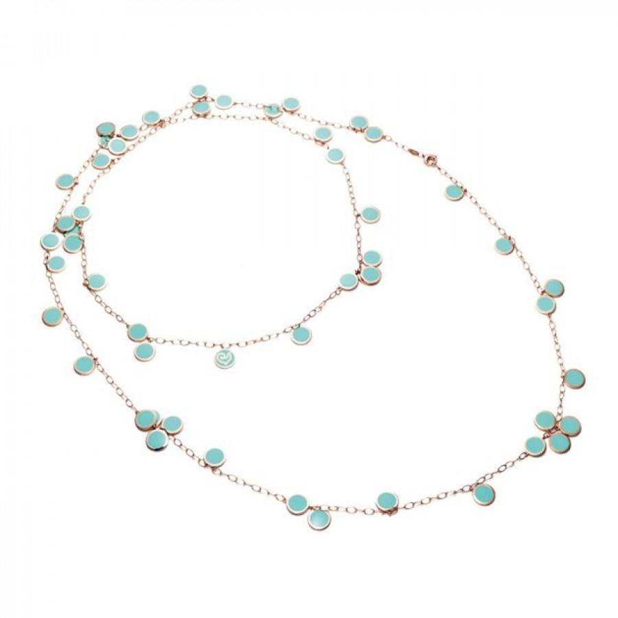 Qui troviamo la collana lunga appartenente alla collezione Chantecler Paillettes in oro rosa 18kt e smalto verde acqua.