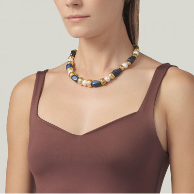 Questa raffinata collana propone il dialogo fra elementi in bronzo martellato dorato, perle naturali d'acqua dolce e segmenti in lapislazzuli. Munita di comoda chisura a T - bar con medesima finitura martellata. Tutto il fascino della fusione a cera persa per un gioiello realizzato completamente a mano in azienda.