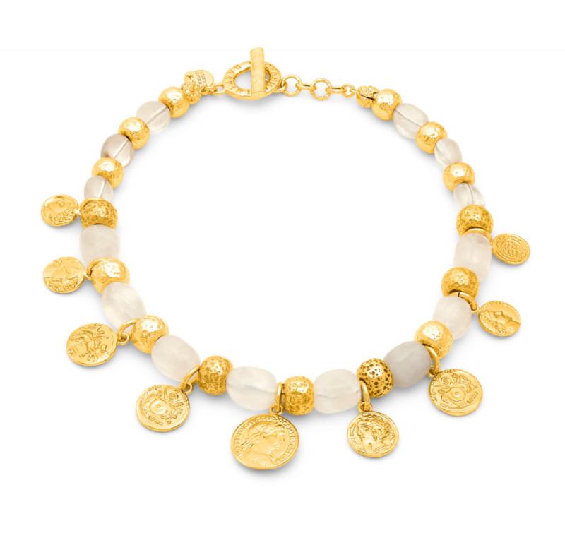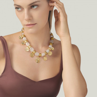 Un’iconica collana che esprime un raffinato dialogo tra il bronzo martellato dorato e i segmenti in cristallo di rocca, creando contrasti di luce e matericità. Il gioiello è impreziosito da monetine in bronzo dorato e completato da una pratica chiusura a T-bar, che unisce eleganza e funzionalità. Tutto il fascino della fusione a cera persa per un gioiello realizzato completamente a mano in azienda.
