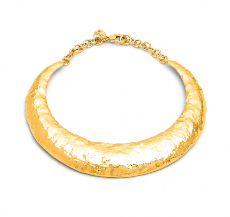 Una collana rigida di grande impatto e dal design iconico, a forma di mezzaluna, realizzata in bronzo martellato e successivamente dorato. La presenza di maglie di regolazione assicura un comfort ottimale e un’allure elegante sul décolleté. Un gioiello fatto a mano, espressione dell’arte orafa e della maestria artigianale di Giovanni Raspini.