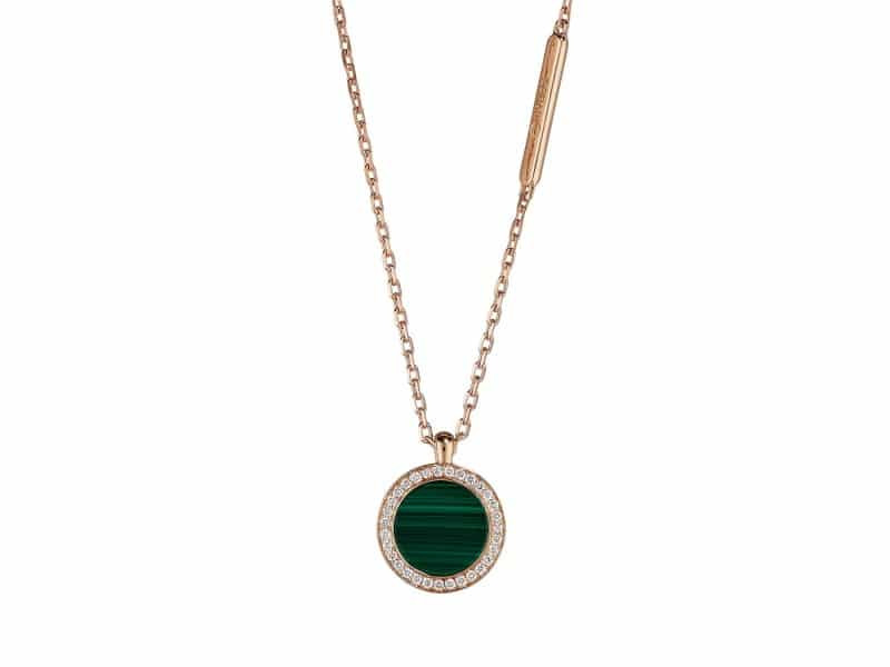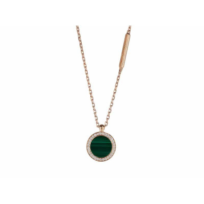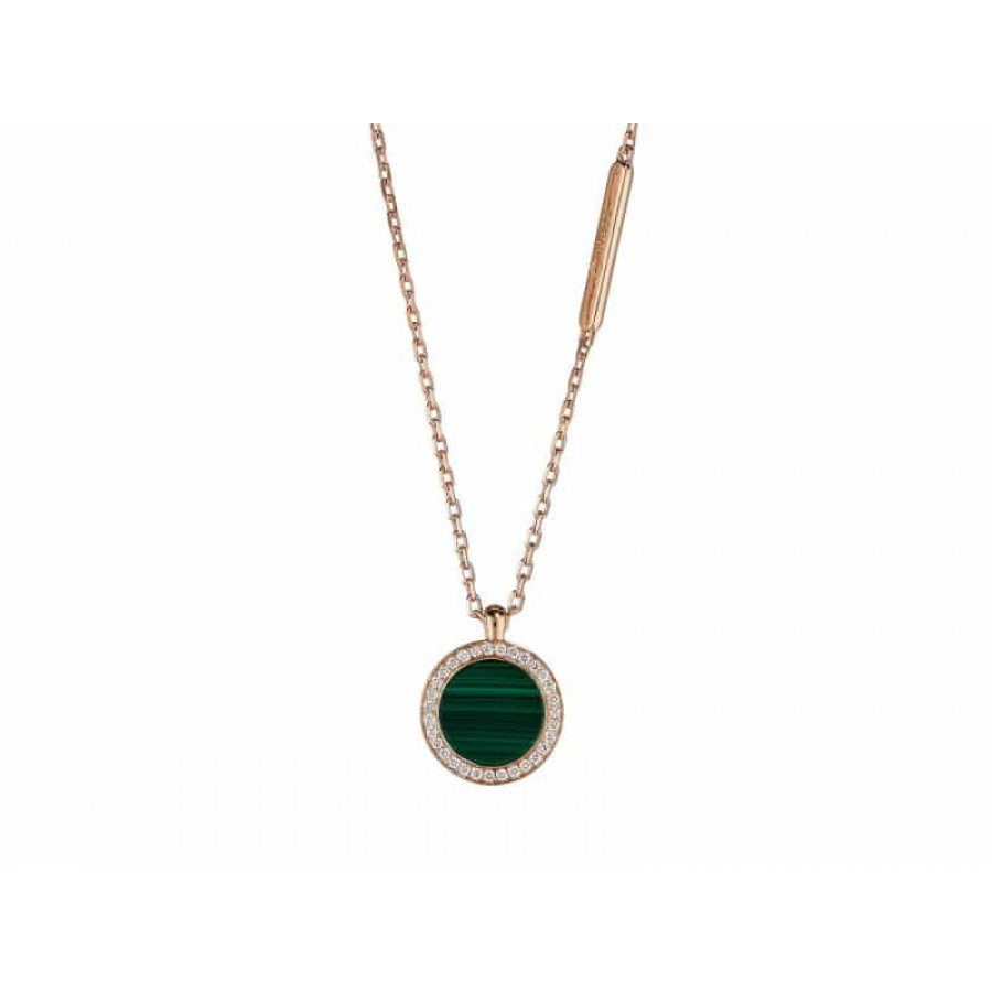 Questo girocollo è realizzato in oro rosa 18 carati ed è caratterizzato da una raffinata catena rolò. Il pendente di forma circolare presenta una pietra in malachite di 2.00 carati, della stessa forma esterni alla malachite troviamo con un giro di preziosi diamanti bianchi di 0.16 carati F SI. Il peso complessivo del gioiello è di 5,00 gr.