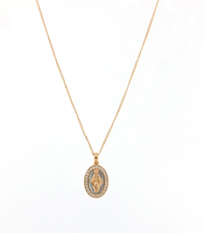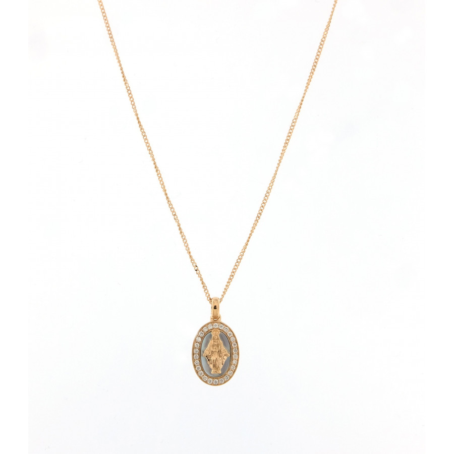 Collana Crivelli oro rosa con pendente Madonna e diamanti bianchi. Questa collana in oro rosato 750°%, con catena a maglia rolò, è composta da un pendente ovale con madreperla e Madonnina in rilievo con cornice di diamanti bianchi. Questa collana è un classico intramontabile, ed incarna l’eleganza senza tempo, rielaborata in stile Crivelli. Design minimal e linee essenziali contribuiscono a dare al gioiello, purezza. Si denota anche dall’attenzione per i dettagli tipica del brand e della lavorazione artigianale orafa, Made in Italy.
