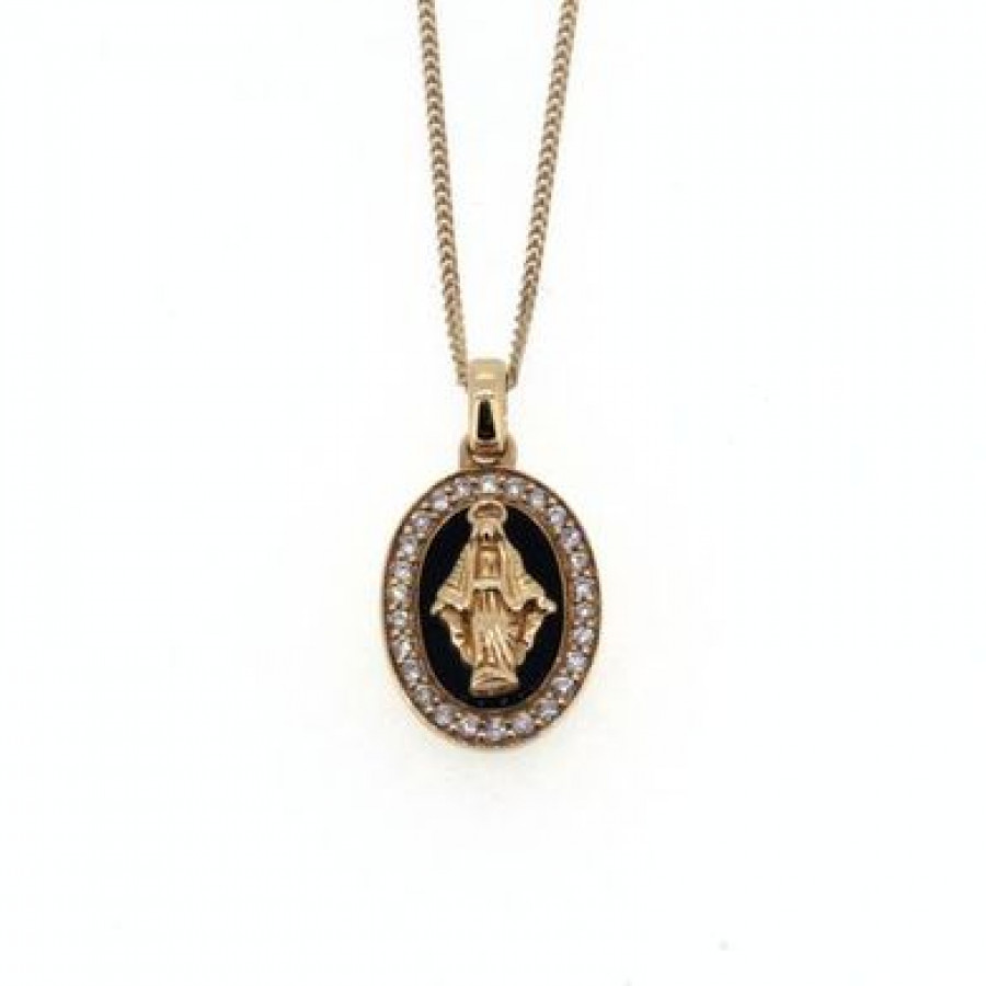 Collana in oro rosa 18kt di cm 43 con medaglia cm 1,7 (compreso anellino attacco collana) "Madonna miracolosa" e diamanti taglio brillante di ct. 0,11 complessivi e base in onice naturale di ct. 0,09.