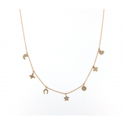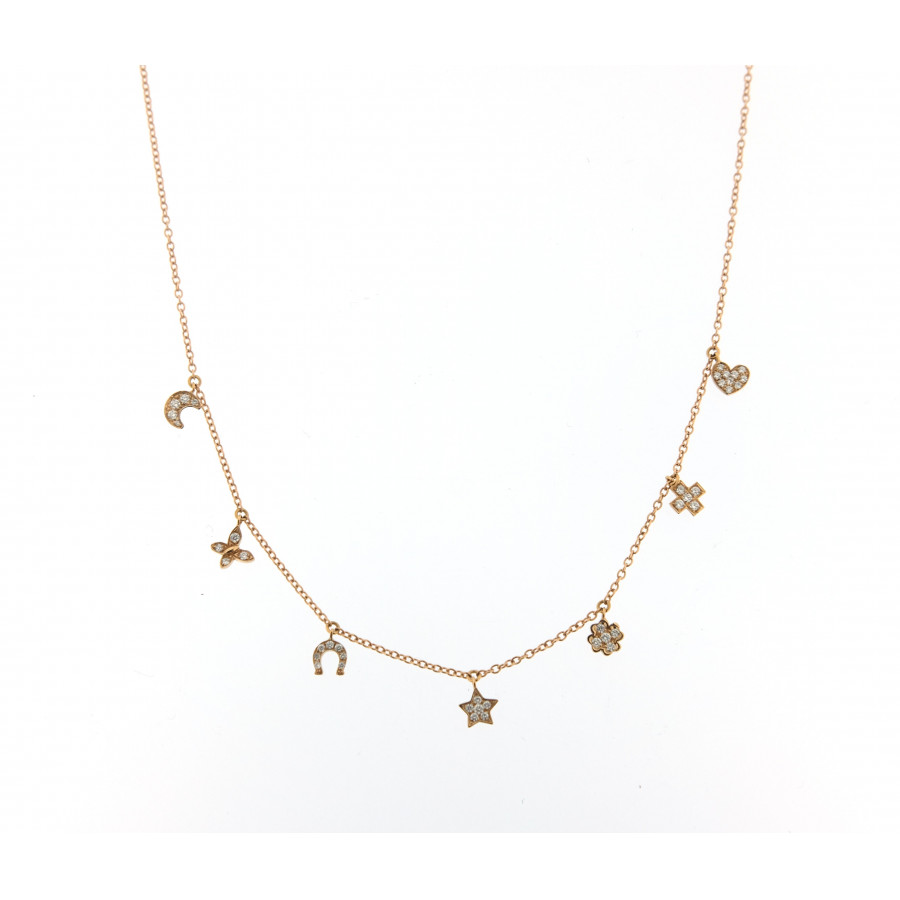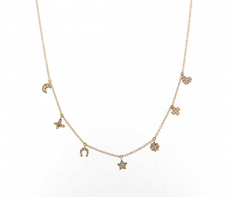 Collana Crivelli oro rosa con piccoli pendenti di diamanti bianchi 0,26 ct. Questa collana è composta da un’anima di catena maglia rolò e piccoli pendenti di varia forma di diamanti bianchi. Una luna, una farfalla, un ferro di cavallo, una stella, un quadrifoglio, una croce ed un cuore; come simboli portafortuna che impreziosiscono e donano luce. Design minimal ma grande attenzione al dettaglio e la lavorazione tipica dell’alta gioielleria.