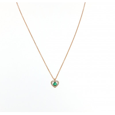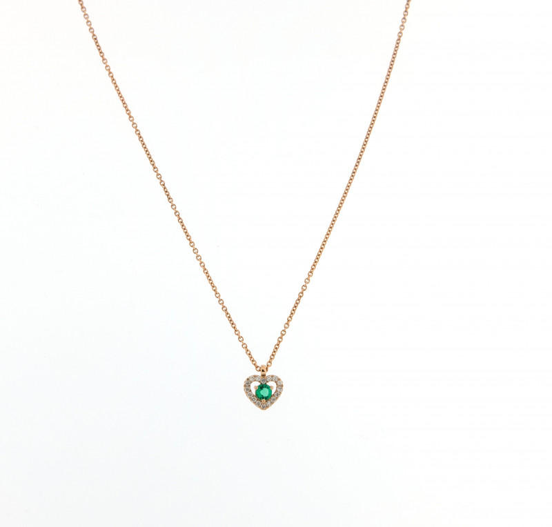 Girocollo Crivelli rosa cuore smeraldo ct 0,07 e diamanti bianchi ct 0,07 GSI. Questa collana è composta da un’anima di catena in oro rosa e pendente a forma di cuore con cornice di diamanti bianchi e smeraldo all’interno. A impreziosire il tutto ed a rendere questa collana davvero molto speciale è il design minimal ma con grande attenzione al dettaglio come lo dimostra lo smeraldo, all’interno del cuore.