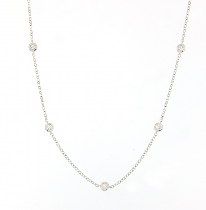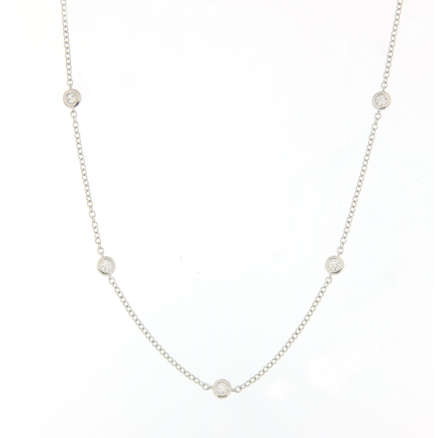 Girocollo Crivelli Punti luce inseriti oro bianco 750°%, con catena a maglia rolò, è composta da undici punti luce con diamante bianco. Questa collana è un classico intramontabile, ed incarna l’eleganza senza tempo, rielaborata in stile Crivelli. Design minimal e linee essenziali contribuiscono a dare al gioiello, purezza. Si denota anche dall’attenzione per i dettagli tipica del brand e della lavorazione artigianale orafa, Made in Italy.