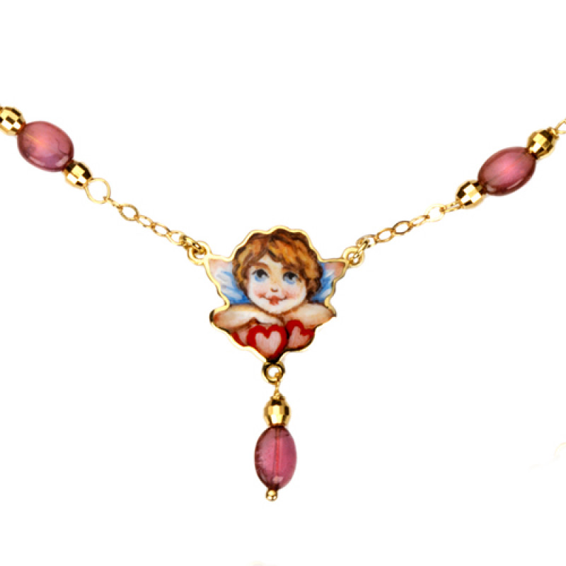 Elegante e delicato girocollo è realizzato in oro 18 carati. In questa versione l’Angioletto è appoggiato su due cuoricini rossi ed ha le ali color blu. Il ciondolo è dipinto a mano con smalti a gran fuoco. Gli Angioletti sono da sempre un simbolo positivo di buon augurio associato alla Famiglia, regalo ideale sia per adulti e piccolini.