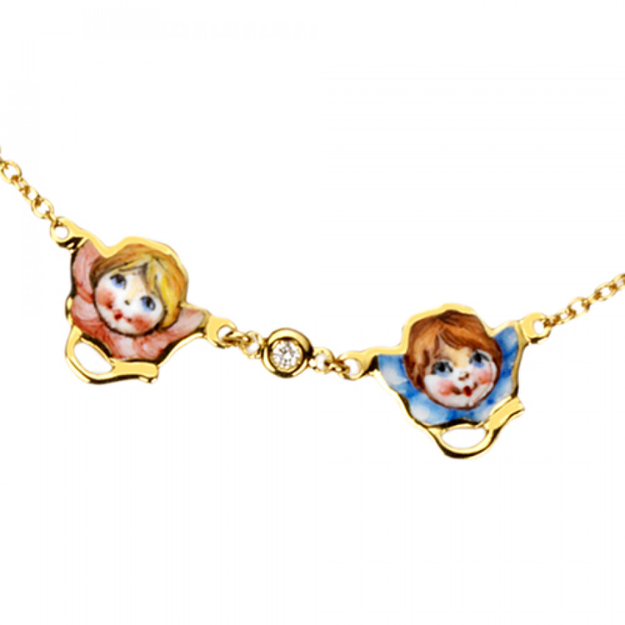 Elegante e delicato girocollo è realizzato in oro 18 carati impreziosito con un diamante centrale. I due Angioletti sono dipinti a mano con smalti a gran fuoco. Gli Angioletti sono da sempre un simbolo positivo di buon augurio associato alla Famiglia, regalo ideale sia per adulti e piccolini.