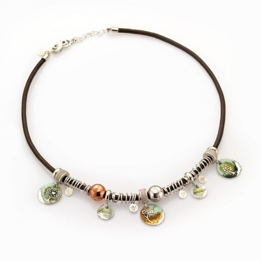 Girocollo completo con 5 Ciondoli, realizzato in Cuoio e con chiusura in Argento 925 Rodiato, di lunghezza pari a 45cm