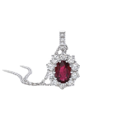 Collana in oro bianco con pietra rubino centrale ct. 0,58 e contorno di diamanti taglio brillante ct. 0,36 G VS