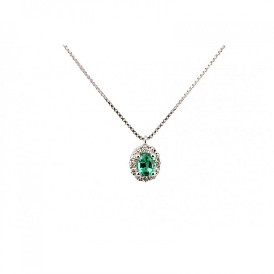 Collana in oro bianco con pietra smeraldo centrale ct. 0,28 e contorno di diamanti taglio brillante ct. 0,13 G VS