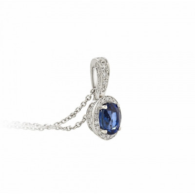 Giorgio Visconti girocollo solitario in oro bianco e zaffiro centrale taglio ovale con contorno di brillanti incassati a pavé.