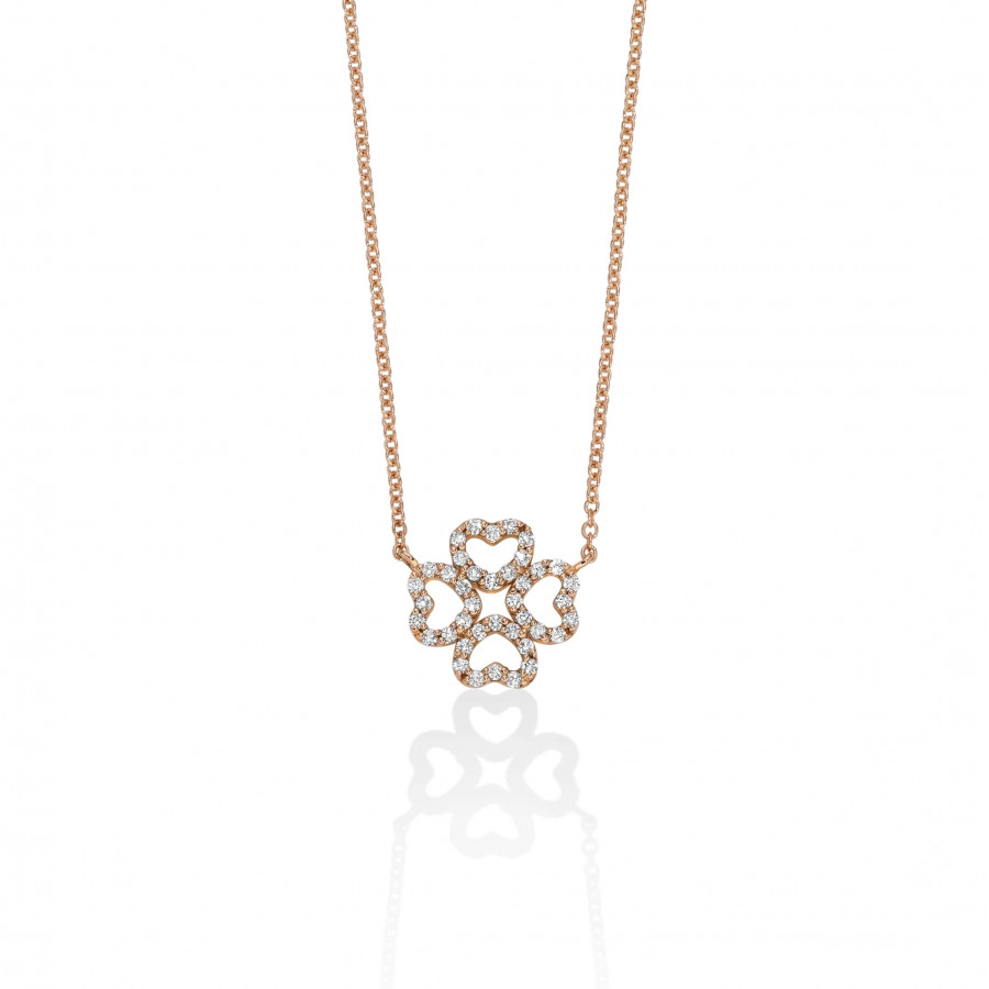 Collana con quadrifoglio a filo in oro rosa 18k e diamanti ct 0,20.