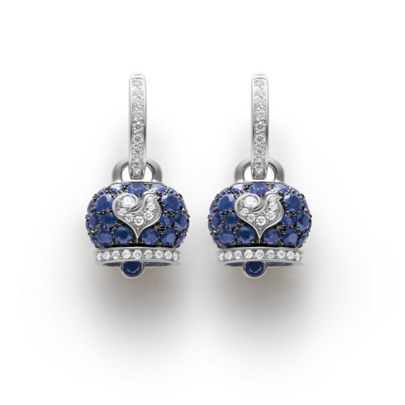 Qui gli orecchini Chantecler Campanelle sono in oro bianco brunito e zaffiri blu, con galletto in oro bianco e diamanti bianchi. Oro a 18 kt.