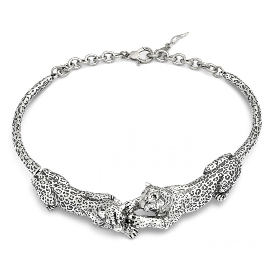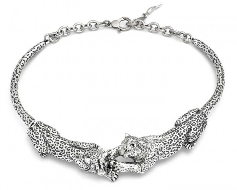 Raffigurante due leopardi adagiati uno di fronte all'altro, in un'armoniosa posa che evoca forza ed eleganza, questa meravigliosa collana è interamente realizzata dai nostri artigiani tramite l'antica tecnica della fusione a cera persa. Questo gioiello è composto da quattro elementi con snodi invisibili che rendono l'indosso particolarmente confortevole. La brunitura dell'argento enfatizza la texture del manto del felino, in una combinazione perfetta di volumi e luminosità.