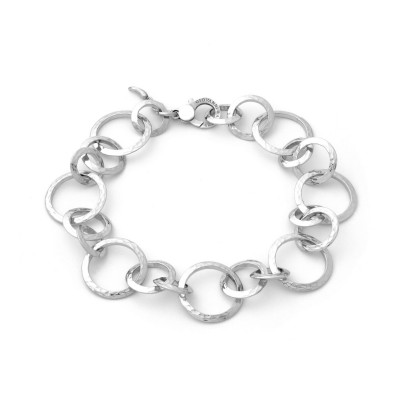 Una collana dalla texture di straordinaria lucentezza, materica, composta da anelli in tre dimensioni intrecciati fra loro, realizzati con lastra d'argento martellata a mano. Un tributo al design contemporaneo firmato Giovanni Raspini.