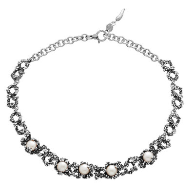 Tutto il fascino delle perle rosa naturali d'acqua dolce, per una collana a tema floreale che stupirà per la delicatezza del decoro e la luminosità che riesce a donare al viso. Una miriade di minuscoli fiorellini modellati a mano in argento brunito e dai petali diamantati, avvolgono le cinque grandi perle dalla nuance tenue e femminile.