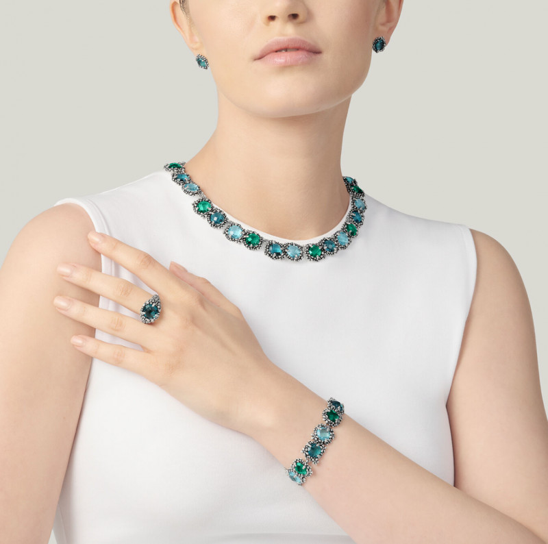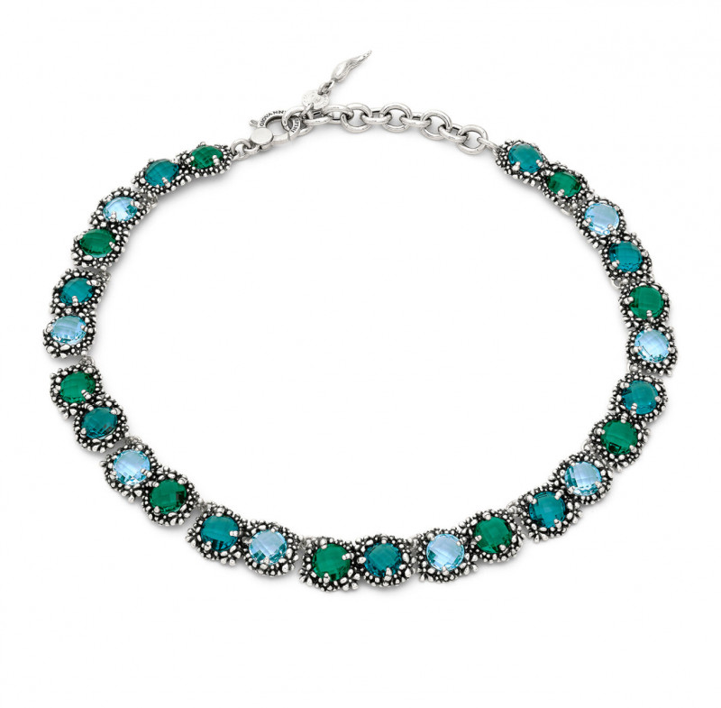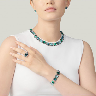 Una composizione armoniosa di ventisei grandi cristalli rotondi sfaccettati, nelle tonalità del celeste, dell’azzurro e del verde smeraldo, dona luce e carattere alla collana Blue Ivy. Il gioiello è impreziosito da un ricercato decoro realizzato con la tecnica della fusione a cera persa, ispirato al tema floreale.