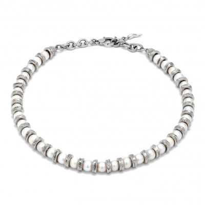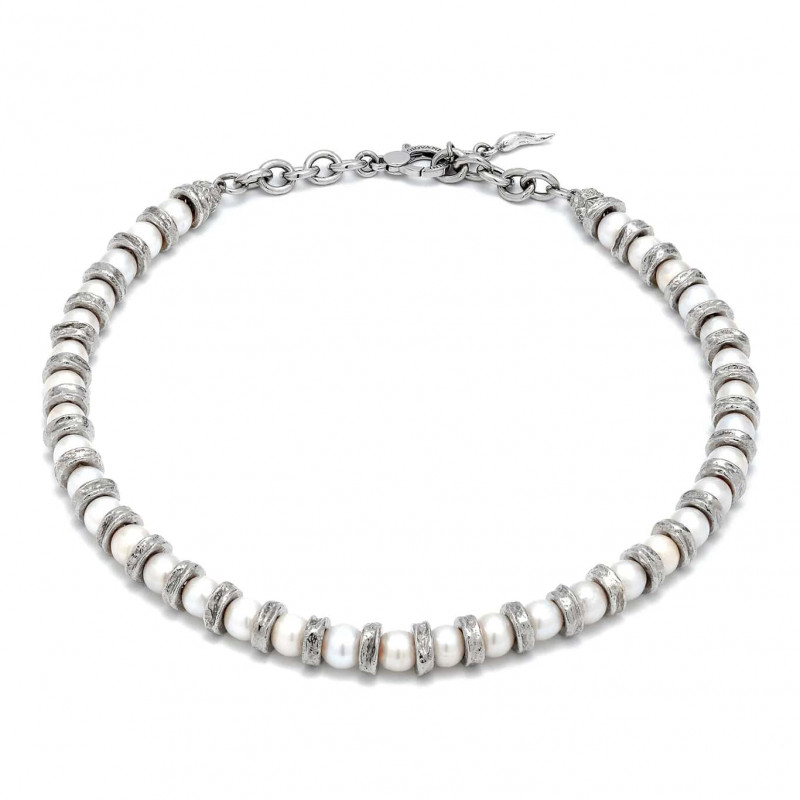 Le perle, da sempre regine della gioielleria, dialogano ritmicamente con delicati elementi in argento, in questa collana che è una vera e propria dichiarazione di stile. Riflessi preziosi cha danno luce al volto, regalando eleganza e bellezza contemporanea, per un gioiello importante, eppure dal decoro minimale.