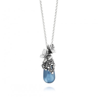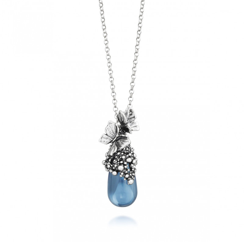 Il pendente Goccia Farfalle nasce dall’incontro tra il cristallo a goccia in una delicata sfumatura blu ciano e il decoro in argento realizzato con fusione a cera persa, che riproduce con grazia il volo di eleganti farfalle. Completa la creazione una catena rolò diamantata in argento 925, lunga 45 cm, che ne esalta la luminosità e la raffinatezza.