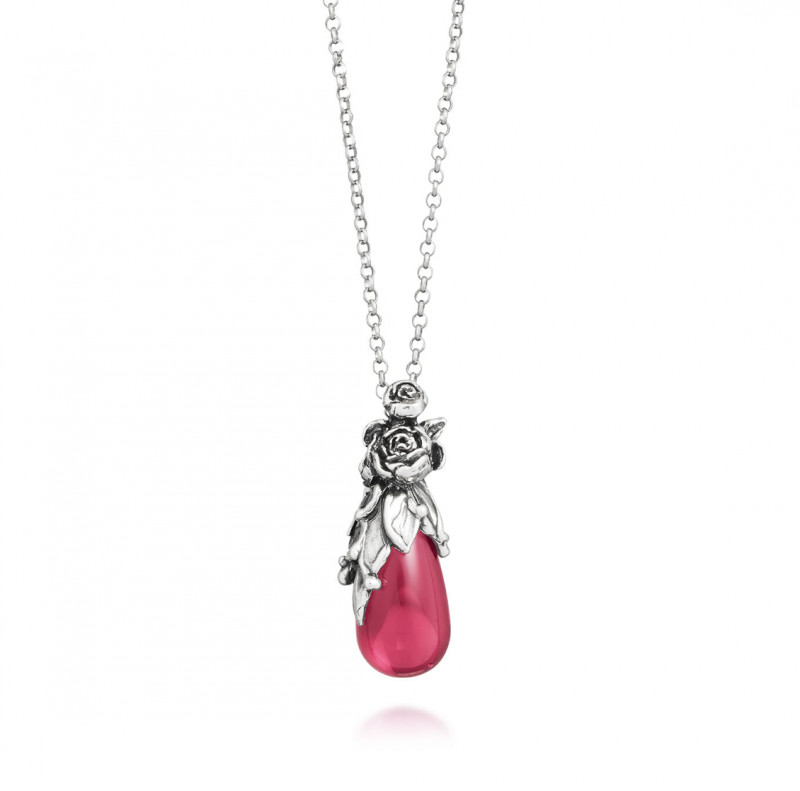 La collana con pendente Goccia Peonie prende vita dall'incontro armonioso tra un decoro floreale in argento modellato con la tecnica della fusione a cera persa, ispirato alla grazia senza tempo dei fiori di peonia, e un cristallo a forma di goccia nelle sfumature tenui del rosa. Completa il gioiello una catena rolò diamantata in argento di 45 cm.
