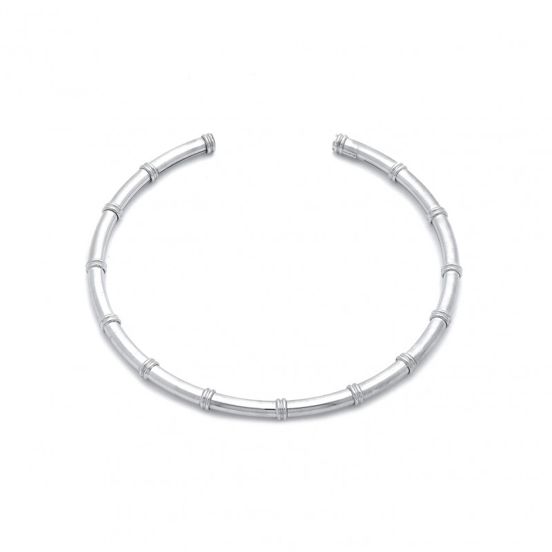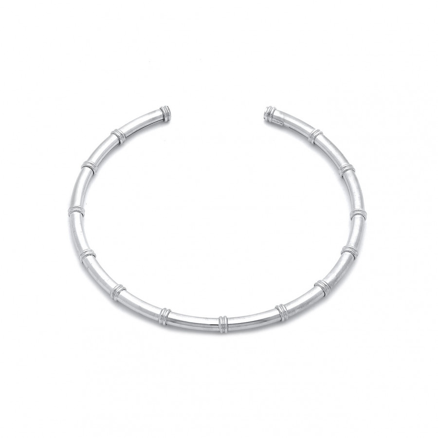 La collana Jackie nasce dalla volontà di Giovanni Raspini di creare un gioiello in argento assolutamente contemporaneo. La lavorazione a canna vuota regala linearità e tanta luce ad illuminare il volto, ed è arricchita da coppie di anelli torniti e saldati sul gioiello con ritmo geometrico. Argento lavorato a mano in Italia.