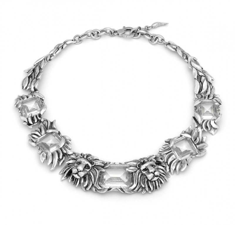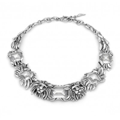 Di grande impatto emozionale, questa collana in argento brunito monta cinque grandi zirconi trasparenti. Il decoro richiama il tema del leone in stile déco, con la chioma dal ritmo forzato e il segno forte, quasi grafico. La sezione centrale è formata dalle due teste di felino che incorniciano un meraviglioso zircone dalla forma rettangolare, in taglio ottagonale sfaccettato. Gli altri zirconi, in taglio carré ottagonale, si disseminano lungo la collana. Realizzata in soli 100 pezzi, completamente a mano tramite fusione a cera persa, in azienda.
