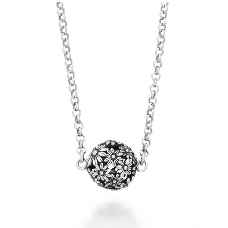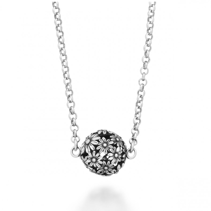 Questa raffinata collana monta una grande boule ricoperta di bellissime piccole margherite in argento brunito, abbinata ad una catena rolò. Ogni singolo petalo dei fiori, realizzati in fusione a cera persa, è diamantato a mano per regalare ancora più luce al gioiello.
