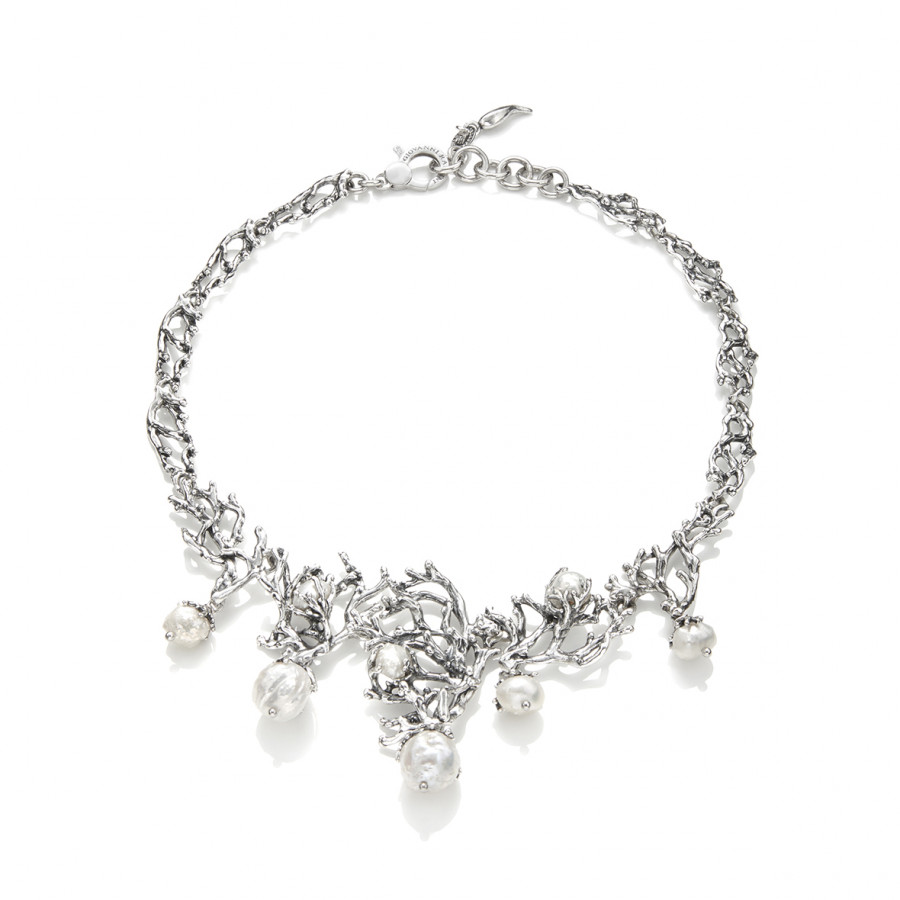 Collezione Mari del Sud - L'argento fluisce in forme coralline e si sposa con le perle naturali d'acqua dolce dai riflessi bianco opalescenti.
