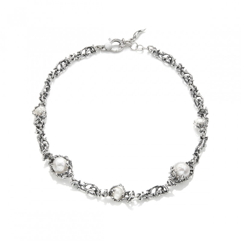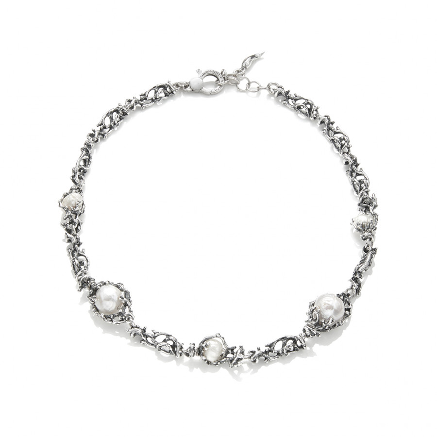 Collezione Mari del Sud - L'argento fluisce in forme coralline e si sposa con le perle naturali d'acqua dolce dai riflessi bianco opalescenti.