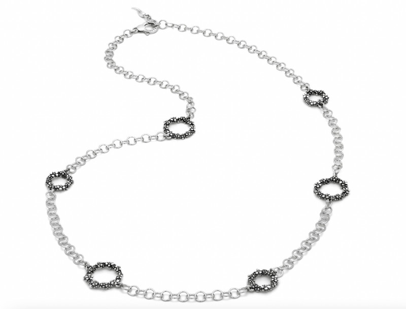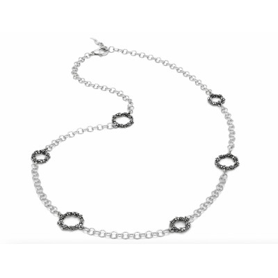 Elegante e leggera, questa collana è creata con la tecnica denominata "diamantatura" che conferisce un effetto scintillante ai minuscoli e graziosi petali in argento che contrastano la base brunita e la catena. La chiusura è con moschettone con maglie di regolazione. Lunga 88 cm è un accessorio made in Italy.