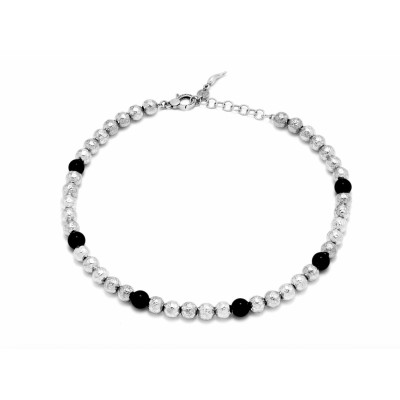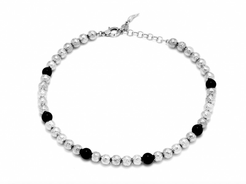 La collana Optical è realizzata con tante sferette in argento martellato alternate a sfere lucide di onice nera. Ispirata alla moda anni '60, questo gioiello è creato a mano in Italia e si presenta con chiusura con moschettone con malie di regolazione.