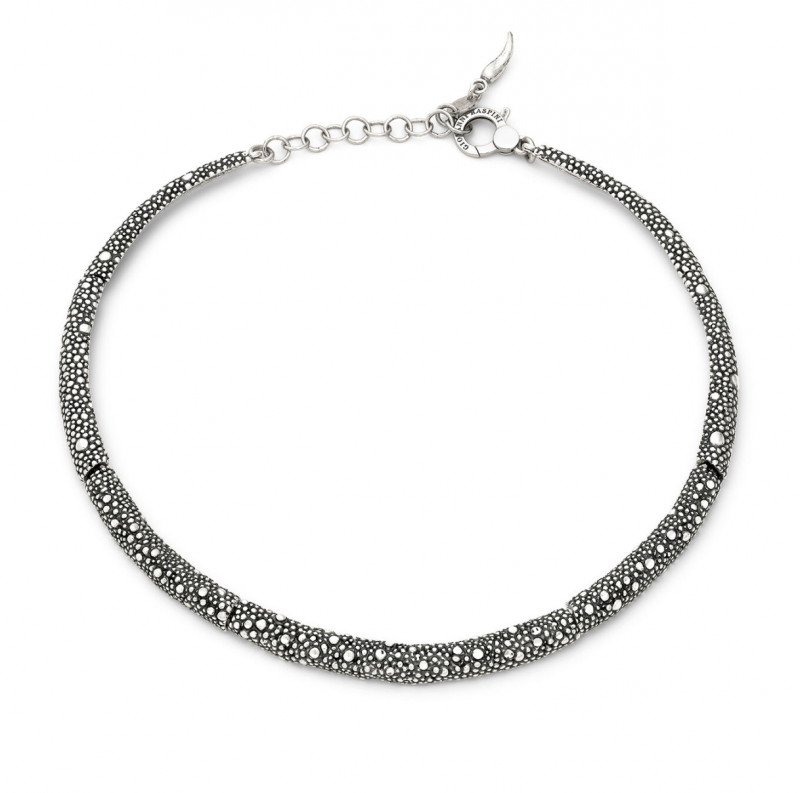 Un capolavoro di maestria orafa, la collana Petit Perlage è una raffinata creazione semirigida che celebra l’arte della fusione a cera persa. Il pavé di sferette in argento brunito, impreziosito da una delicata diamantatura, crea un suggestivo gioco di luci ed ombre che conferisce all’intero gioiello una texture contemporanea e sofisticata.