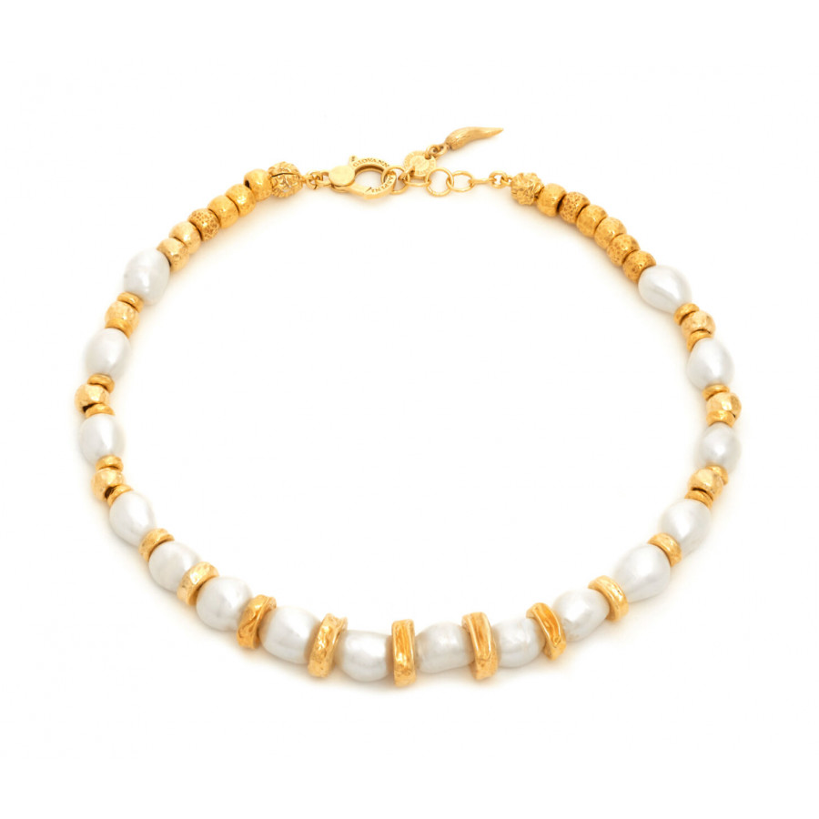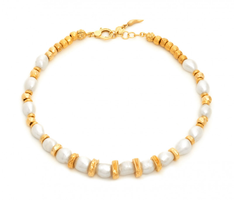 La collana Riviera evidenzia il forte legame stilistico fra le perle barocche d'acqua dolce e gli elementi in argento dorato. Una grande collana, ricca di luce e materia preziosa, per un'estate indimenticabile.