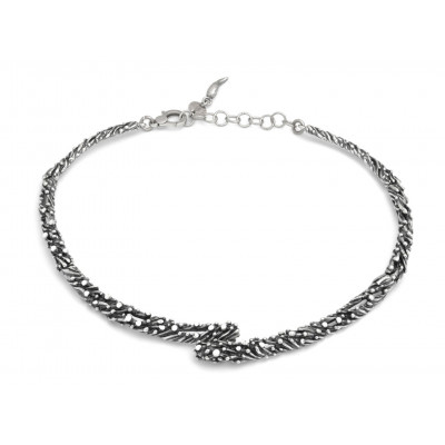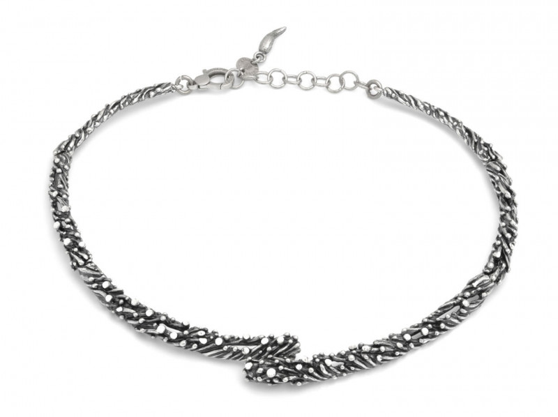 Una collana elegante dai particolarissimi effetti luminosi. Il chiaroscuro dell'argento brunito dialoga con la brillantezza delle superfici, scolpite a taglio vivo, per un gioiello che evoca il fascino misterioso della Luna e il contrasto tra l'oscurità e la sua luce. La collana è realizzata a mano in azienda.