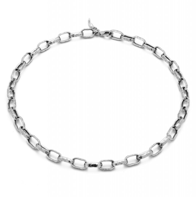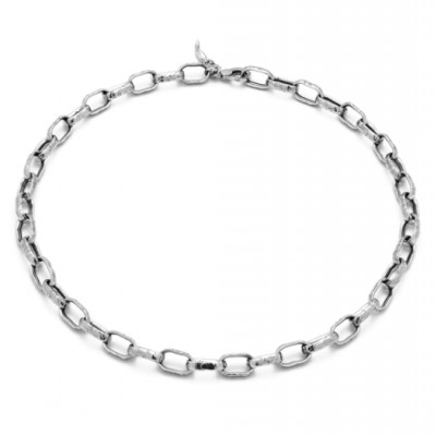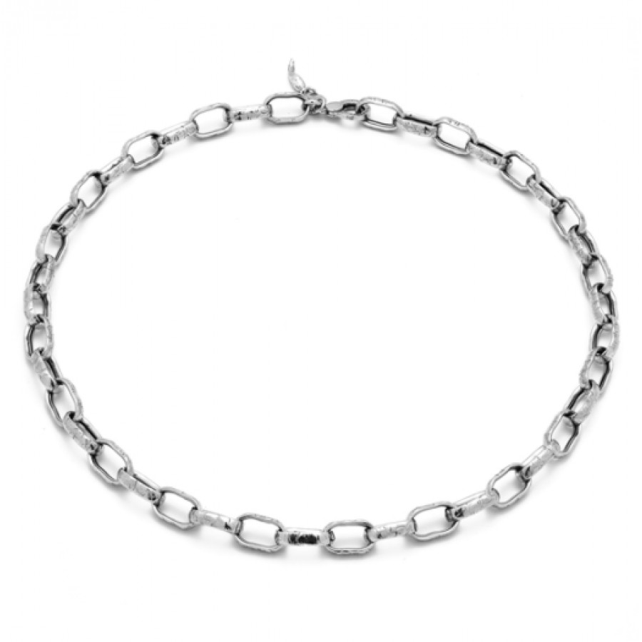 Collezione Catene - La collana Soho esprime tutta la raffinata semplicità del gioiello più classico e diffuso, la catena, grazie all'utilizzo di maglie in lastra martellata di grande impatto materico. Volumi eleganti e luminosi come solo l'argento consente.